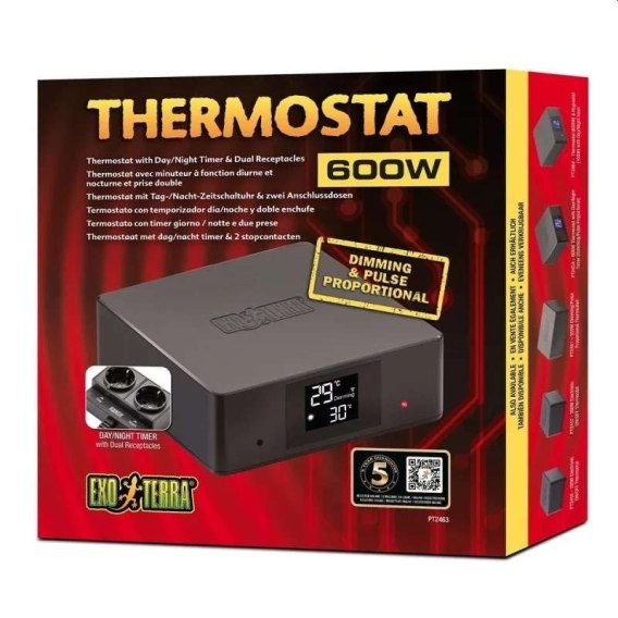 Exo Terra Termostat Pulsacyjny 600 W Dzień/Noc to nowoczesne urządzenie do precyzyjnego sterowania ogrzewaniem w terrarium. Dzięki technologii Dimming & Pulse Proportional zapewnia stabilne i bezpieczne warunki temperaturowe, zbliżone do naturalnego środowiska gadów.